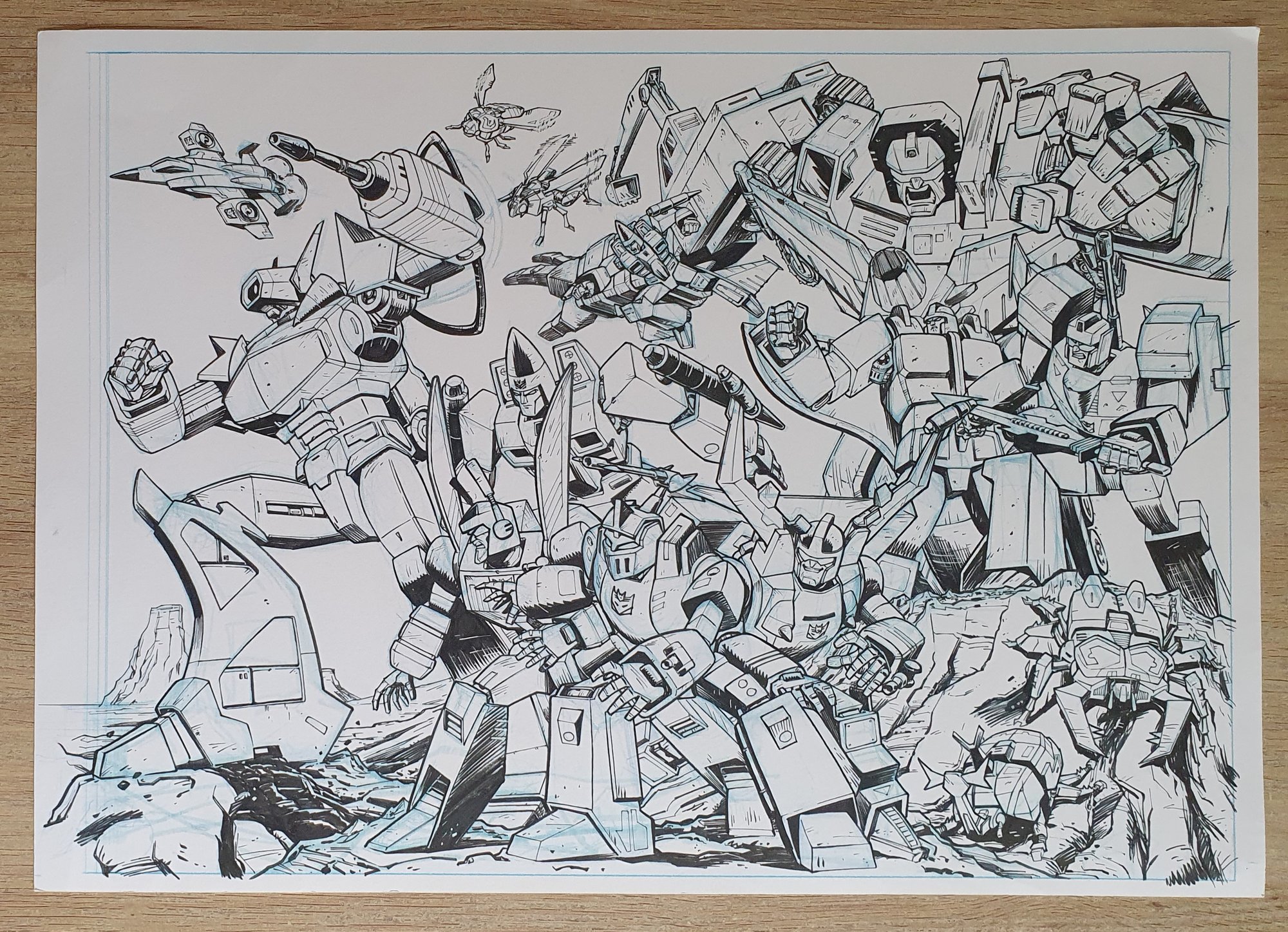 Original Ink over pre-printed blueline pencils on 42 x 29.7cm Bristol Board. Original art pictured. Comes free with colour prints of both 85 Autobot & Decepticon line-ups, coloured by Josh Burcham.