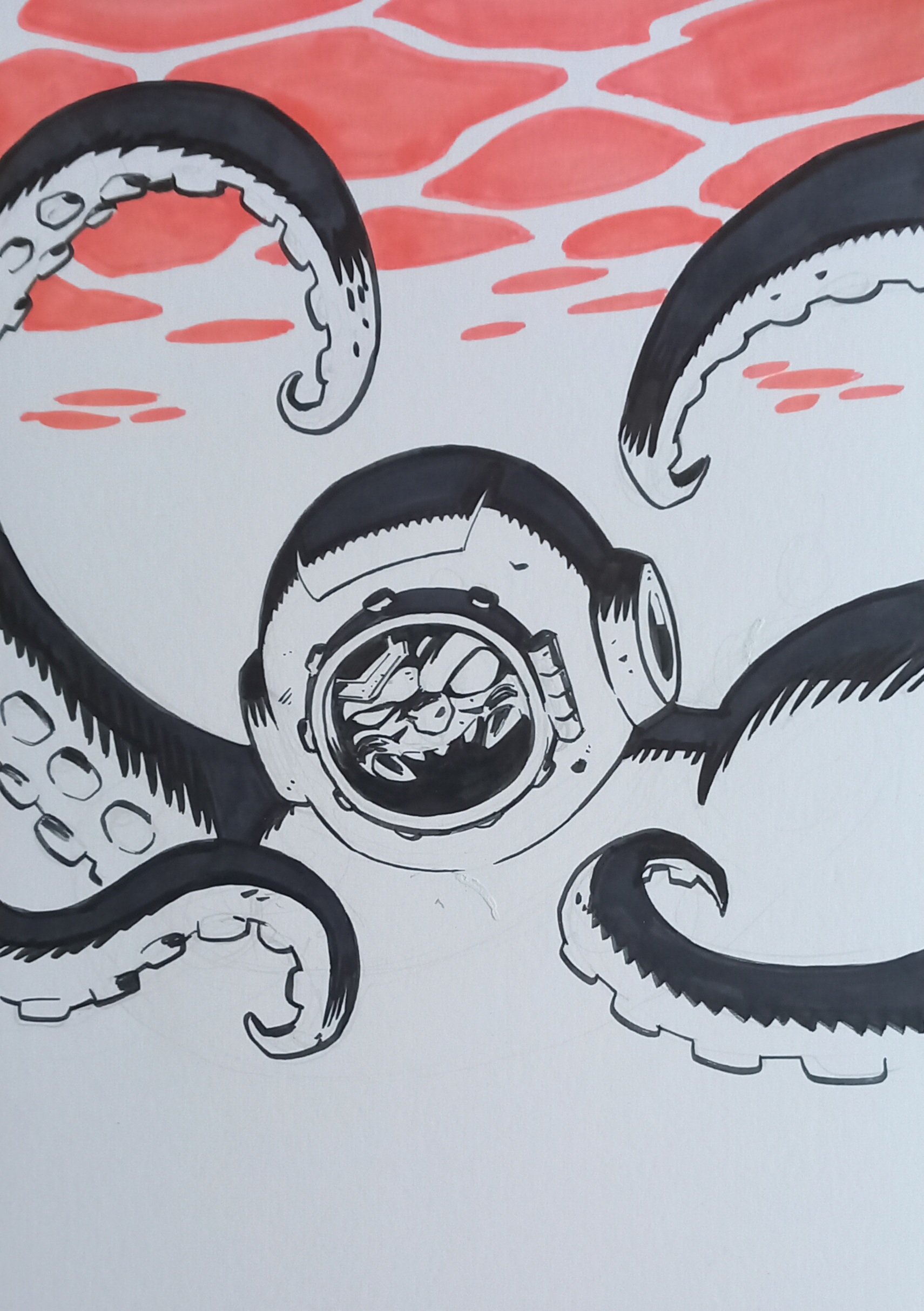 A5 (14.9 x 21cm) hand-drawn inks over pencils with orange and grey tone elements on Bristol Board. One of a kind!